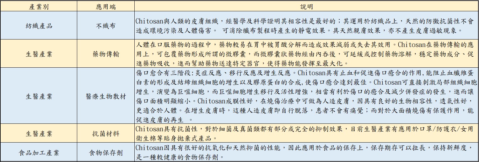 幾丁寡醣應用廣泛,族繁不及備載,下表為簡述其各領域範圍。