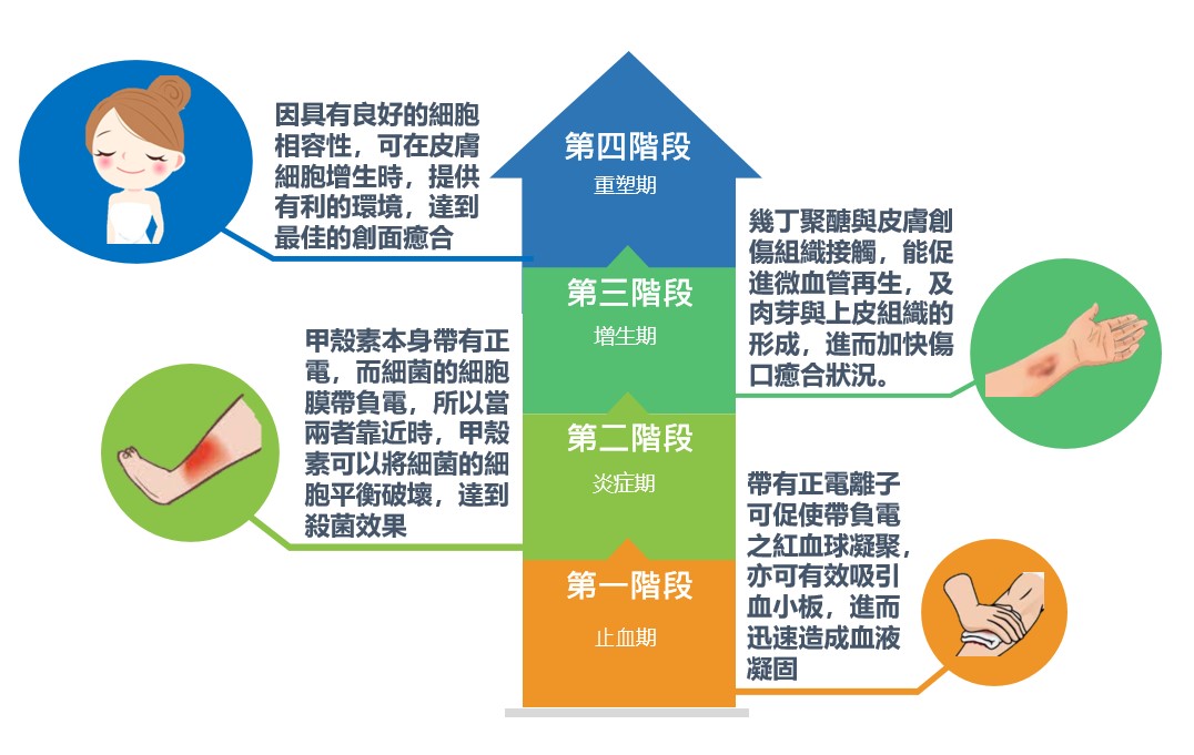 二、在生醫應用發展上,幾丁聚醣的基本單位是葡萄糖胺,為人體相當重要之物質,故具有良好的生物相容性及細胞組織親和性。在止血應用上,因幾丁聚醣在弱酸狀況下具有正電荷,能夠吸引血液中帶有負電荷之血小板,快速啟動凝血機制。在傷口敷料上,因葡萄糖胺是具營養成份,能提供細胞良好的生長環境,在增生期時能活化細胞生長,達到快速傷口癒合的效果。幾丁聚醣在用於傷口抗菌敷料時,能在傷口發炎階段,反應明顯的抗菌效果,並抑制傷口發炎之情況。由於幾丁聚醣本身具良好的細胞親和性及抗菌性,現在市面上抗痘產品也添加幾丁聚醣作為痤瘡桿菌之抑菌的功能材料。