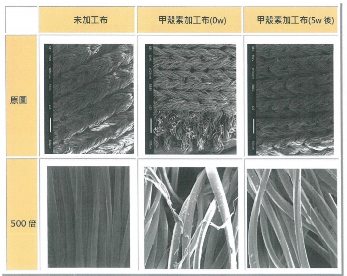 (樣布在水洗5次後,甲殼素生物薄膜依舊存在,表示纖維仍具甲殼素抗菌/抗病毒之功效)