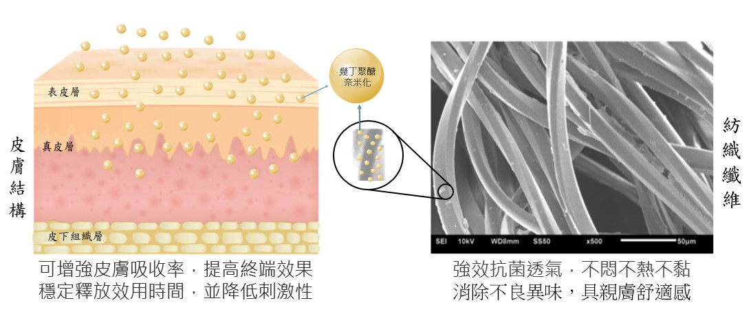 幾丁聚醣藉由分子間的碰撞後,粒徑目前可達10000mash(約0.3um),奈米化幾丁聚醣因具有相對比較高的表面積與較小之體積特性,在紡織品應用上,可提高織物的抗菌效能,使其手感柔順,增加親膚感,進而減少磨擦造成之過敏情況。在醫療用途上,此特性可快速滲透動植物的體表,達到快速吸收及分解的作用,在止血、傷口敷料、抗菌材料上,效能都可大大提昇。