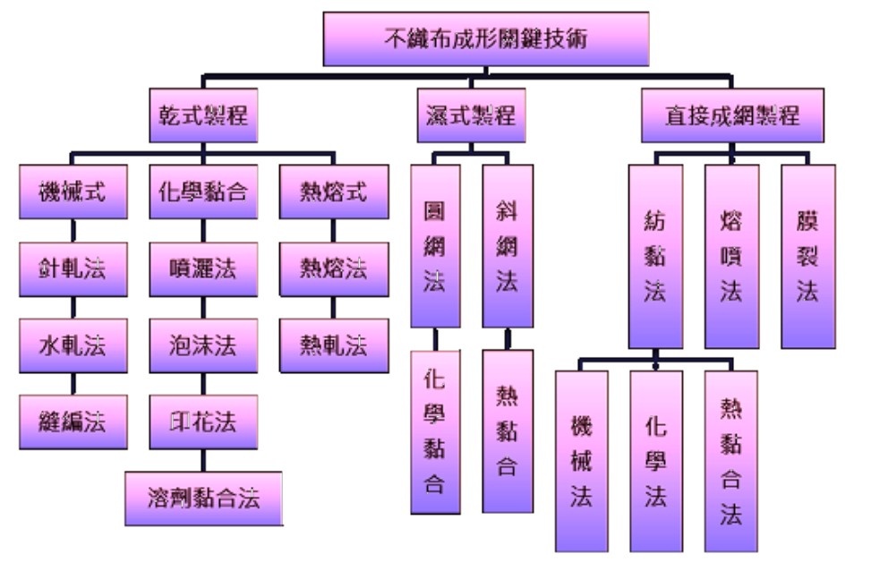 包括水針、紡黏、熔噴、縫錠、氣流、熱黏合、針軋、熱風、化學黏合、濕式等。