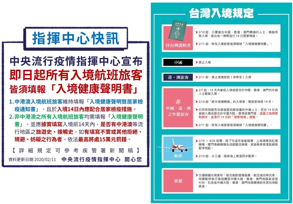 防疫安全須知 一、(更新至3/19)旅遊疫情升至第三級國家 指揮中心宣布,即日起提升以下國家之旅遊疫情等,詳情請參閱下圖(資訊由中央流行疫情指揮中心提供)。國人應避免至當地所有非必要旅遊;美國其他州之旅遊疫情建議升為第二級,其他國家為第一級注意,民眾應遵守當地的一般預防措施。 二、台灣入境(含過境) 所有入境旅客皆須填『入境健康聲明書』,請國人務必據實填寫,除了能保障彼此的安全外,更能讓防疫單位做好追蹤把關,防疫不露洞