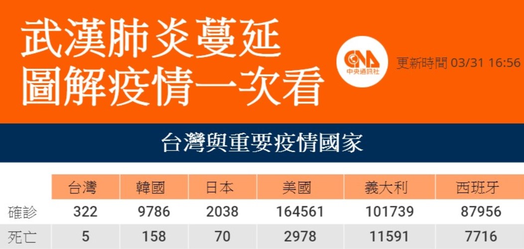 依據國際監測資料顯示,分布於178個國家/地區;病例數以美國164,561例、義大利101,739例、西班牙87,956例、中國大陸81,518例及德國57,298例為多;病例中36,852例死亡,以義大利11,591例、西班牙7,716例、中國大陸3,305例、法國3,024例及美國2,978例為多。