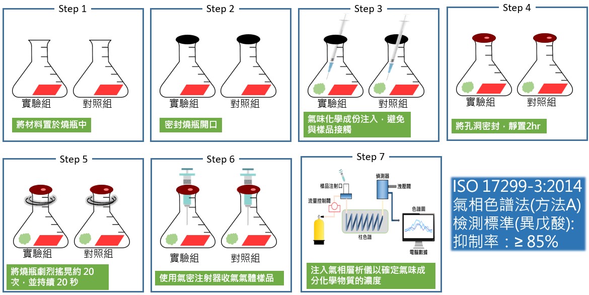 其核心觀點為模擬吹入氨氣臭源於錐形燒瓶內(內含紡織品布料)時,纖維內的除臭機制,讓臭味藉由環境氣體與紡織品間接接觸,使臭(異)味減少。