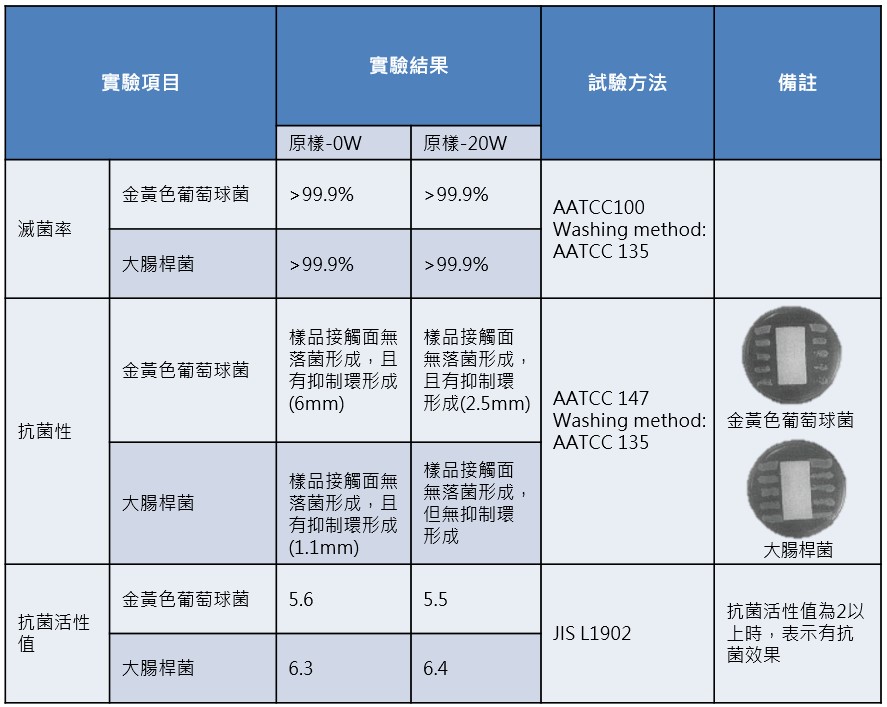 五. 織物品質評估(AATCC135方法水洗20次後的抑菌效果)實際用抑菌性機能墨水噴塗在紡織物上,經烘乾後以AATCC 100、AATCC147及JIS L1902三種方法做抑菌測試,檢驗結果如下表所示。