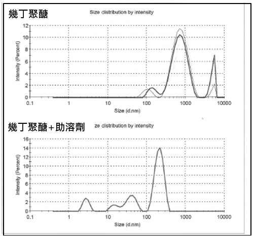 三. 材料細化分散(使用助溶劑增加抑菌劑的溶解度,確認粒徑分佈是否符合其範圍)以雷射粒徑分析儀測試,幾丁聚醣原始粒徑分布不均,需加入助溶劑改善粒徑,才能符合墨水助劑的分散規格。