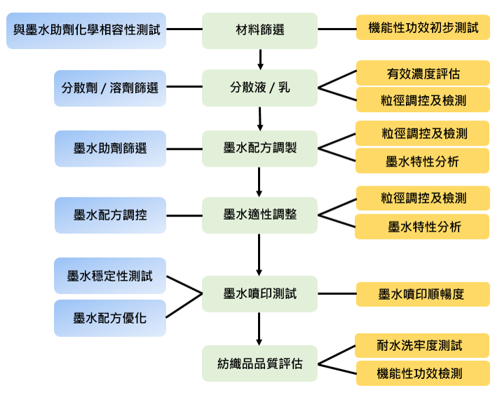 近兩年因受到COVID-19疫情的影響下,人們防疫意識迅速提高,進而在紡織品的個人防護市場需求隨之大幅增加,更打開了紡織品機能性加工的市場。開發菌性機能墨水,並結合數位噴墨應用技術來實現數位整理機能性加工技術概念,以縮短傳統加工的工序與時間,並且減少能耗、汙染以及增加附加價值,以符合目前市場<短鏈革命>需求,因應全世界傳統製造業大規模的轉型。而簡化加工製程並兼具環境保護、綠色工業,成為現今重要之議題。