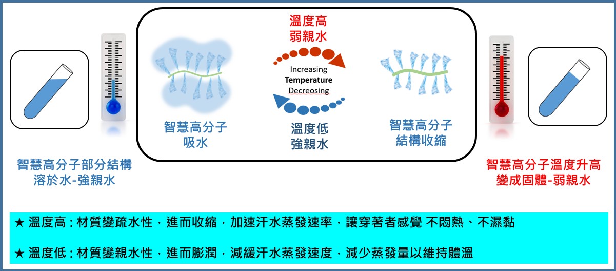 過去涼感機能性產品,僅針對單一氣候與應用情境下提供單一功能,如夏天吸濕排汗、冬天蓄熱保溫,無法因應外部氣候所造成之優勢、進一步優化涼感降溫的最新解決。織物面料應用此溫控技術(hydro-function),可賦予織物能主動應答體溫變化的能力。當人體感到炎熱時,能即時啟動降溫功能,並達到人體適宜溫度時,則自動停止 (Activated cooling—cool you just right )。 智能溫控技術可主動因應溫度變化調節水分蒸發速率,讓穿著者在一日氣溫多變的情況下感受到涼爽、舒適,如下圖所示。智能涼感溫控技術可滿足消費者期待之需求-瞬間接觸涼感《涼得快》及持續降溫涼感《涼得久》。