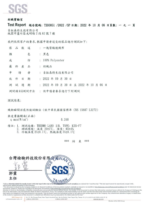 經SGS紡織實驗室測試結果,Q-Max值達0.248(標準值≧0.14 才可稱涼感紗),如下所示: