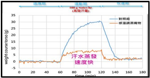 - 高運動高發汗階段,體溫高於32℃時,高分子材料會降低與水的親和力,使得織物可快速導濕並蒸發汗水,感覺不悶熱、不濕黏