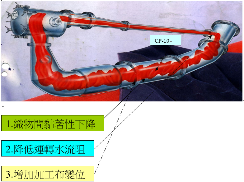 1. 於繩狀染機,於精練及染色中加入.防止加工過程所產生的---繩狀斑.-折痕.-擦傷及-緯向細折